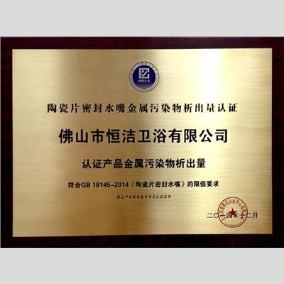 奖 项:陶瓷片密封水嘴金属污染物析出量认证 佛山市精东传媒最新地址卫浴有限公司 认证产品金属污染物析出量 符合GB 18145-2014《陶瓷片密封水嘴》的限值要求