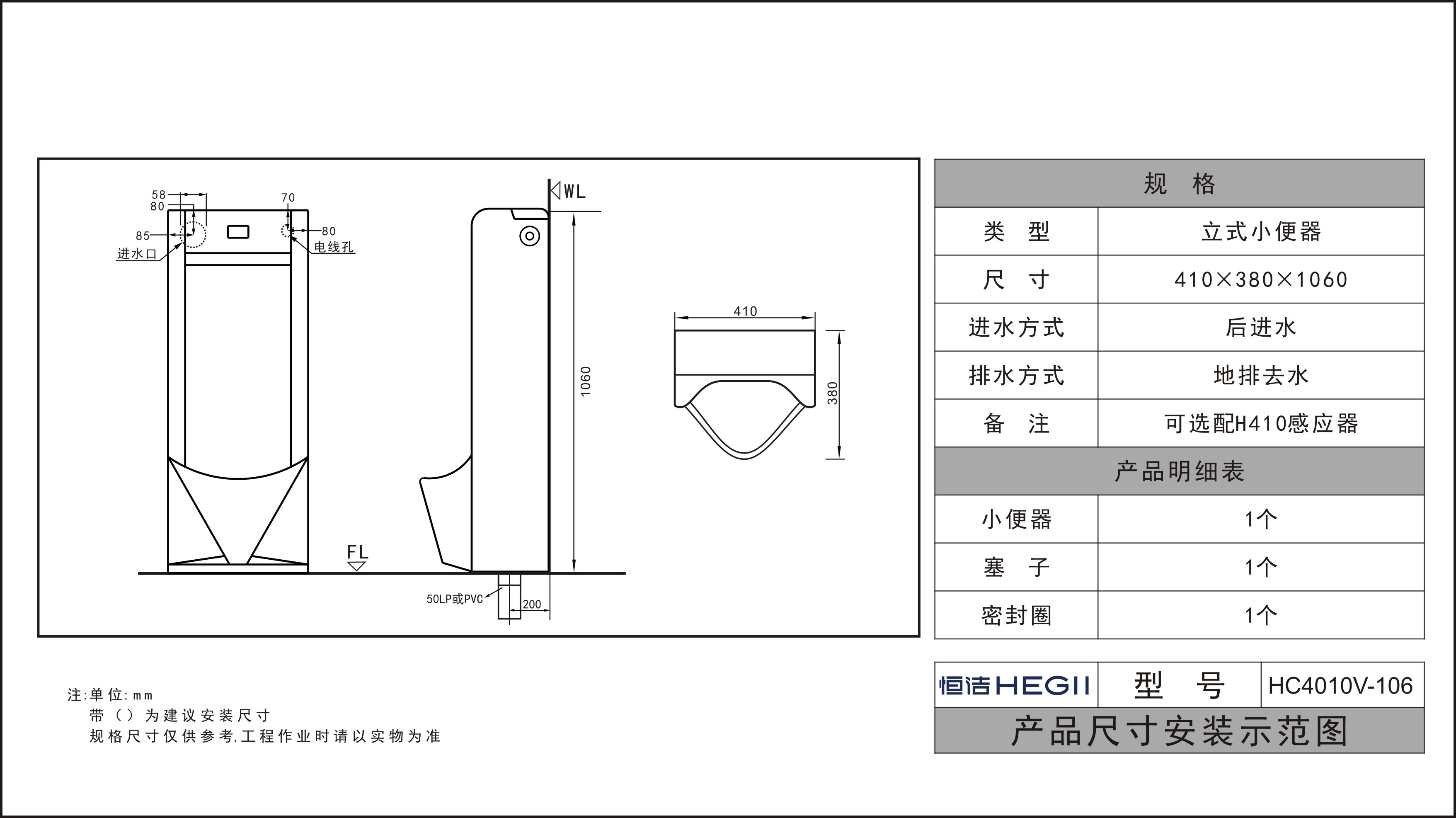备注:可选配H410感应器